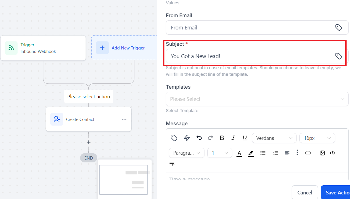Click "+" on the workflow builder to add an action, choose "Create Contact"